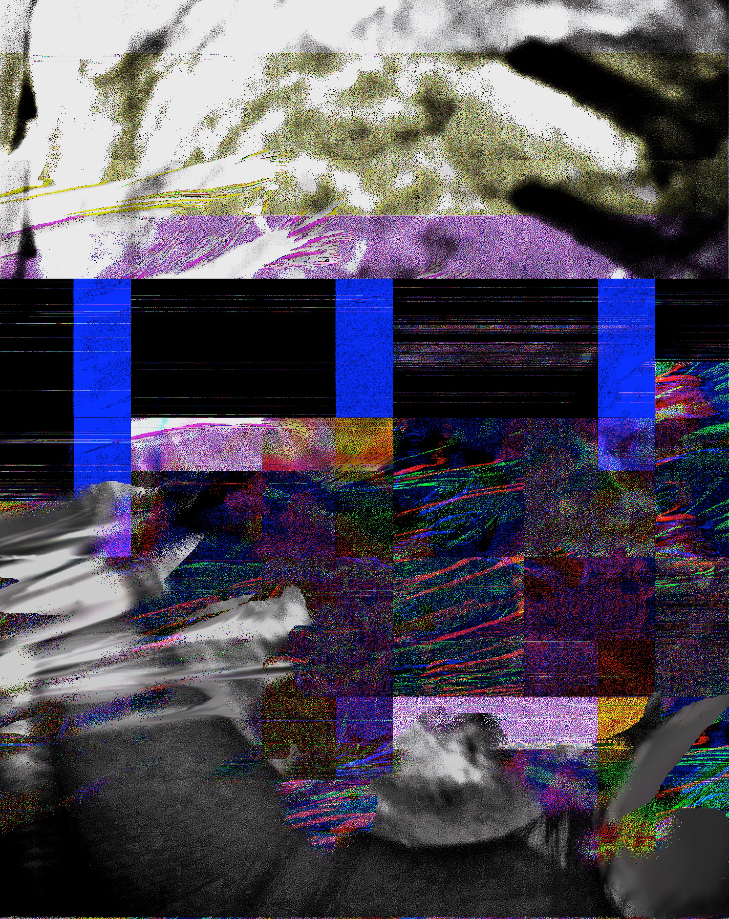 Glitch Me (2015) explore le glitch comme prisme du monde : là où l’excès d’informations engendre des interférences, l’« erreur » devient force vitale. Le glitch diffracte la réalité et rassemble des couples contraires — désordre et intégration, abstraction et figuration, contrôle et contre-contrôle, identité et multiplicité.