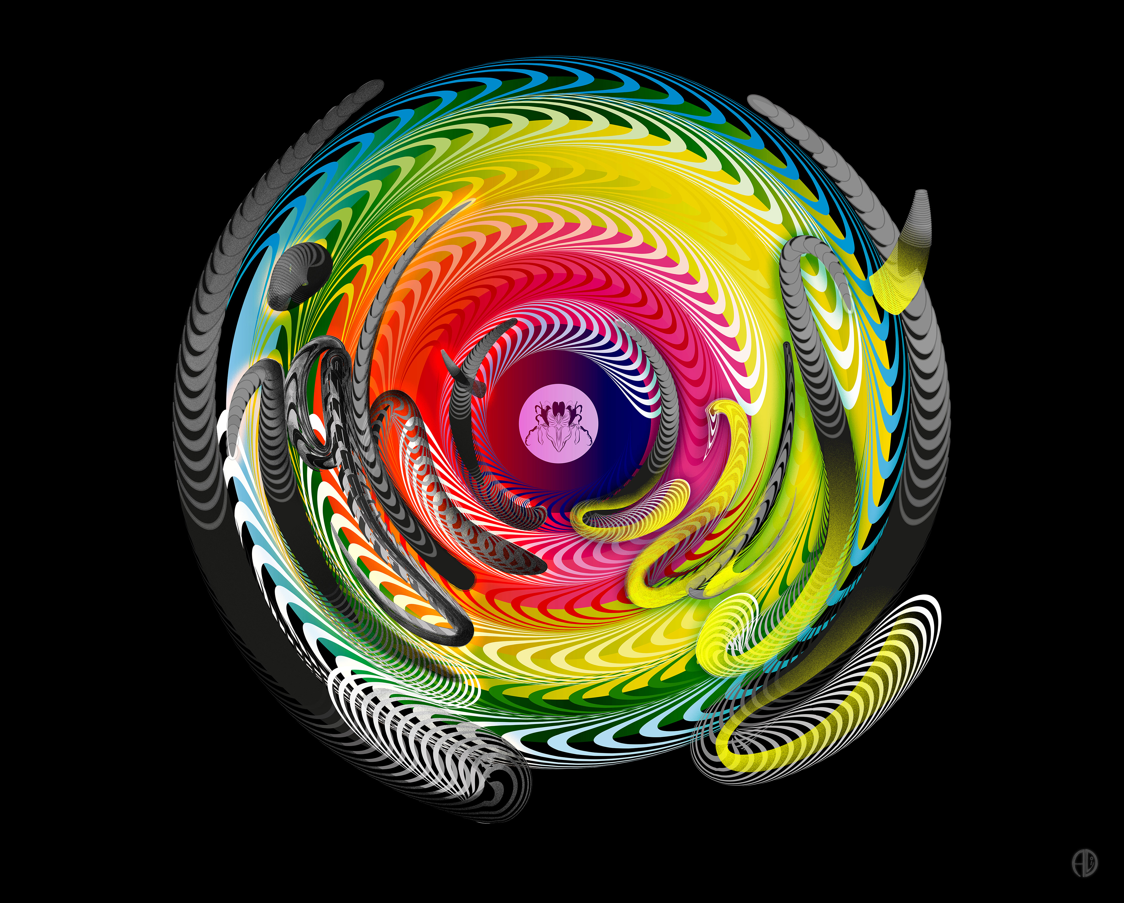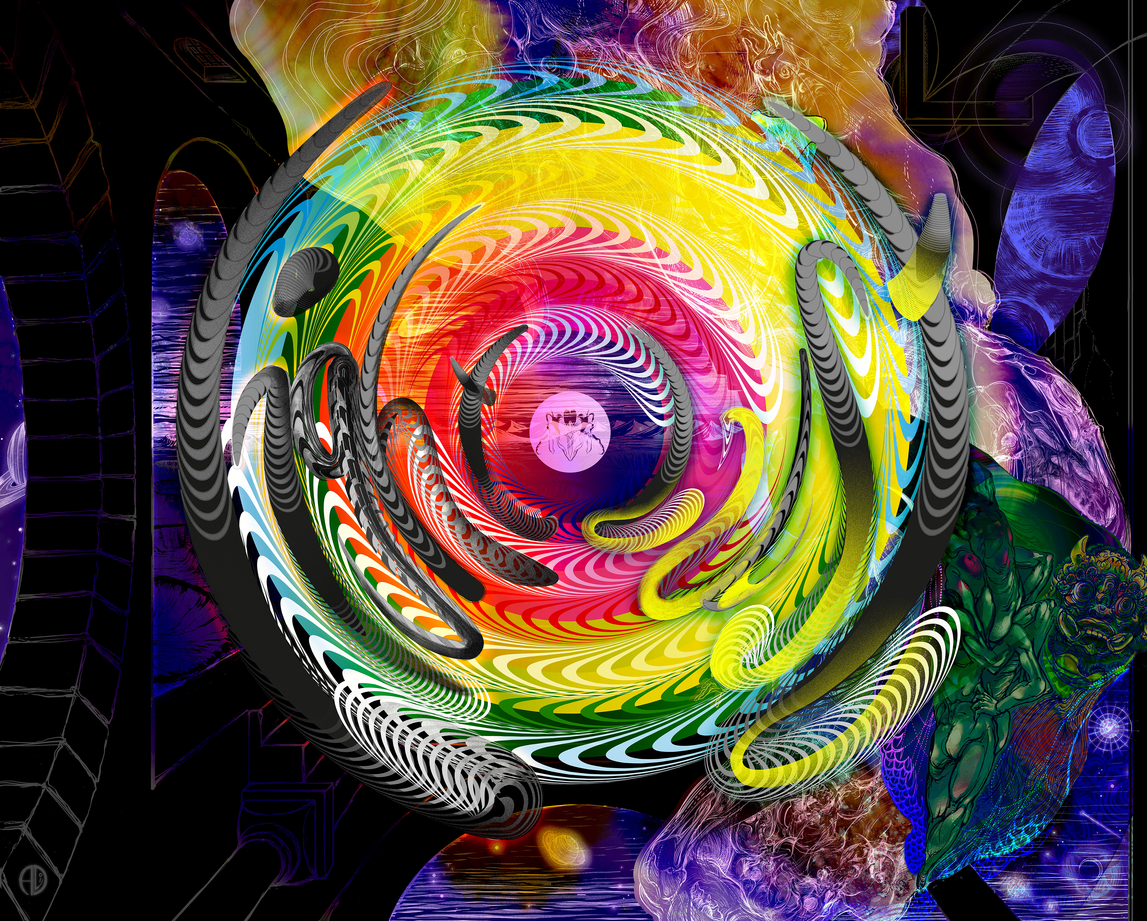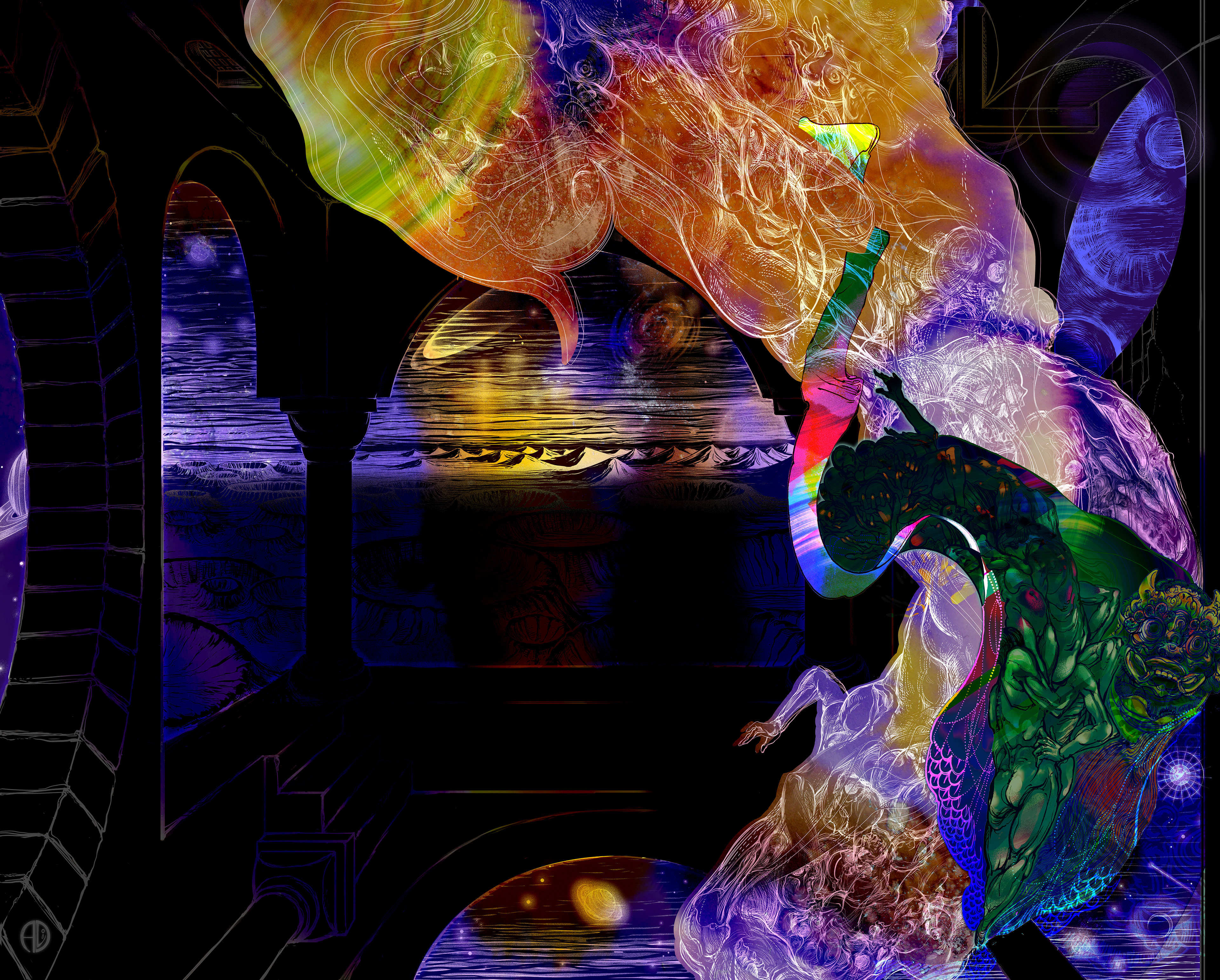 L’espace de fond paraît monofocal (perspective à un point), mais se révèle plurifocal : une perspective dispersée, multidimensionnelle, en cohérence avec la logique non-duelle du projet.