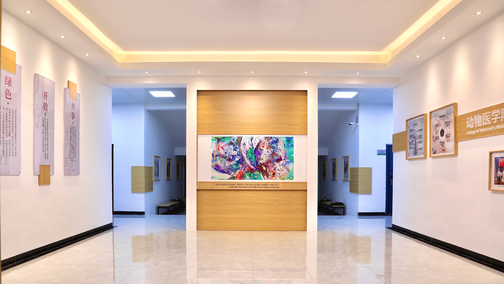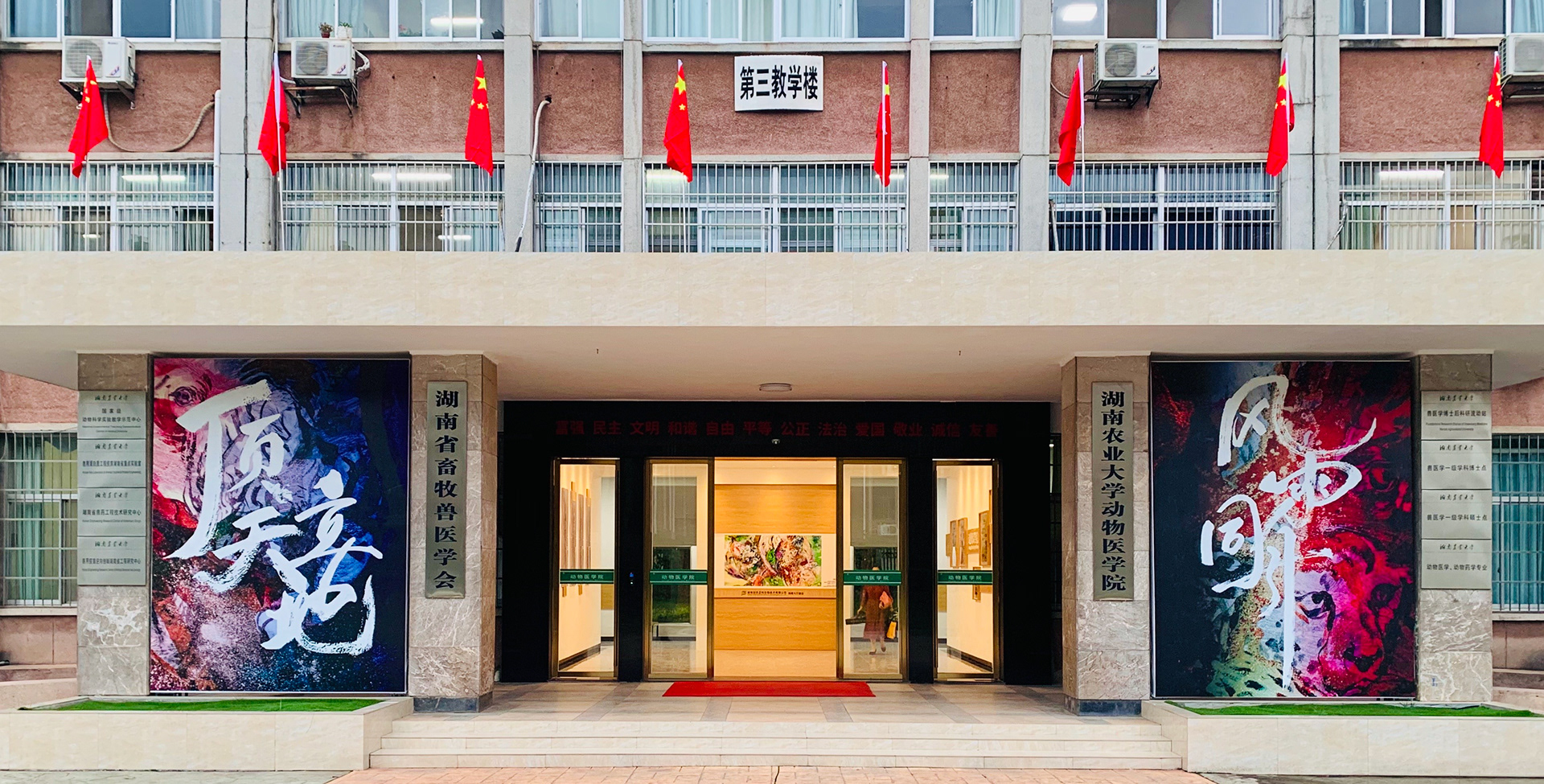 Photos de l’œuvre Resplendissement (Can《燦》), en collection permanente de l’Université d’agriculture du Hunan, ainsi que des affiches calligraphiques présentées lors de la cérémonie de remise des diplômes 2020.